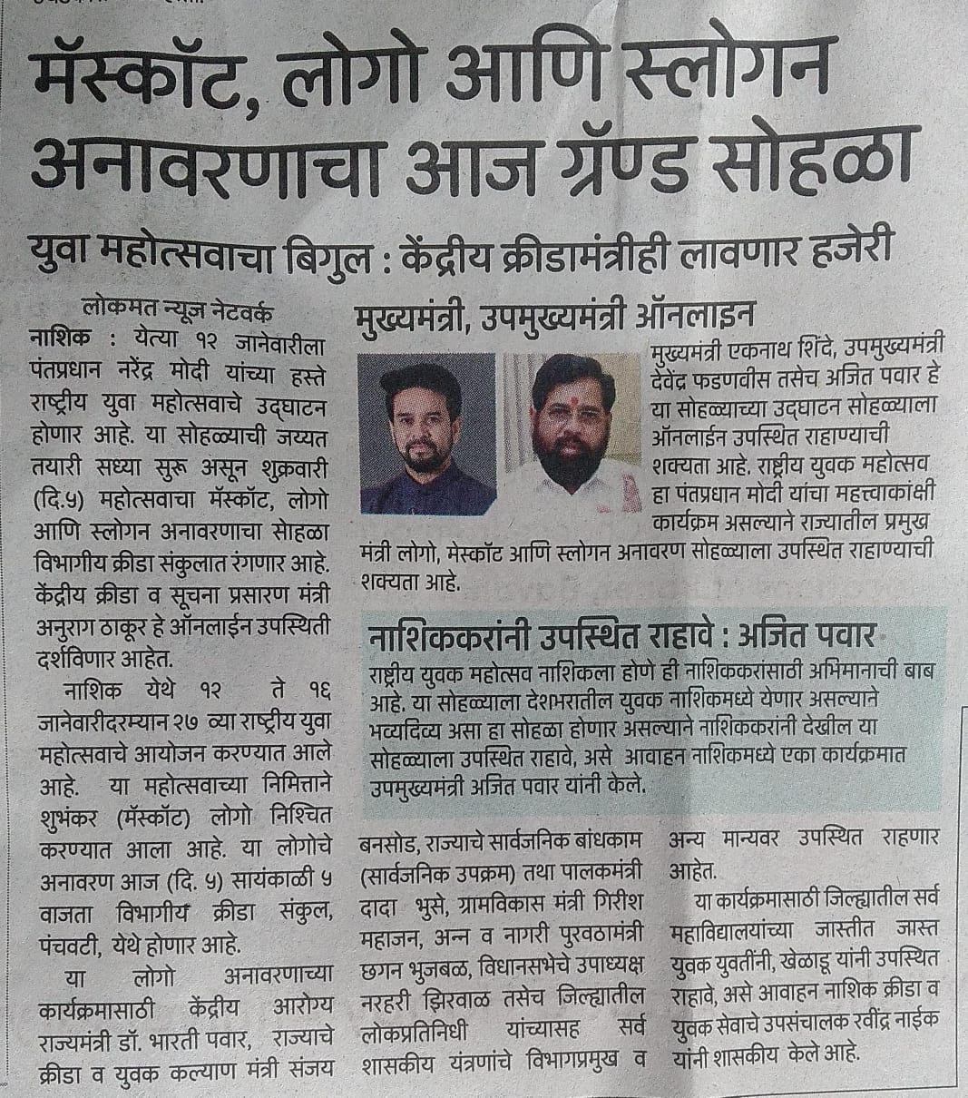 A special event has been organized on January 5, 2024, at 5:00 pm to unveil the logo and mascot of the National Youth Festival. This program will be conducted at the Divisional Sports Complex located on Hirawadi Road, Nashik.